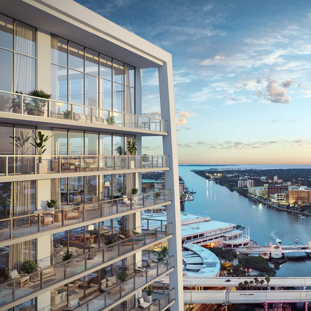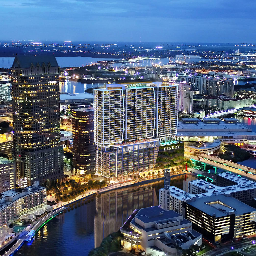 Pendry Residences Tampa, Tampa's new highrise on The Tampa Riverwalk. A collection of fully-serviced luxury residences, Pendry Residences Tampa offers spacious interior living with thoughtful touches and high end finishes. An expansive terrace allows for sweeping city and water views from every Residence.