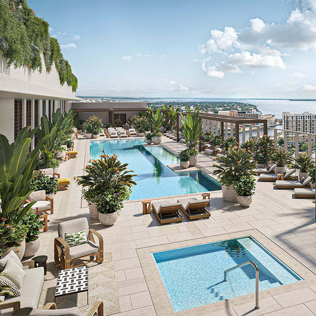 Pendry Residences Tampa offers artfully designed social spaces, including a private residential entry lobby, rooftop pool and sundeck, private lounges, and wellness facilities.